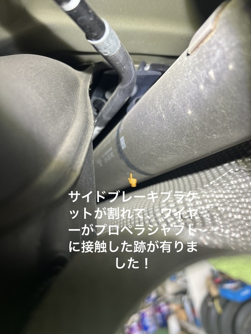 お客さんの言われる通りサイドブレーキワイヤーのブラケットが割れワイヤーがプロシャへ当たって音がしてました。